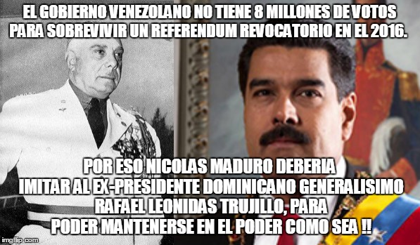 EL GOBIERNO VENEZOLANO NO TIENE 8 MILLONES DE VOTOS PARA SOBREVIVIR UN REFERENDUM REVOCATORIO EN EL 2016. POR ESO NICOLAS MADURO DEBERIA IMITAR AL EX-PRESIDENTE DOMINICANO GENERALISIMO RAFAEL LEONIDAS TRUJILLO, PARA PODER MANTENERSE EN EL PODER COMO SEA !!
